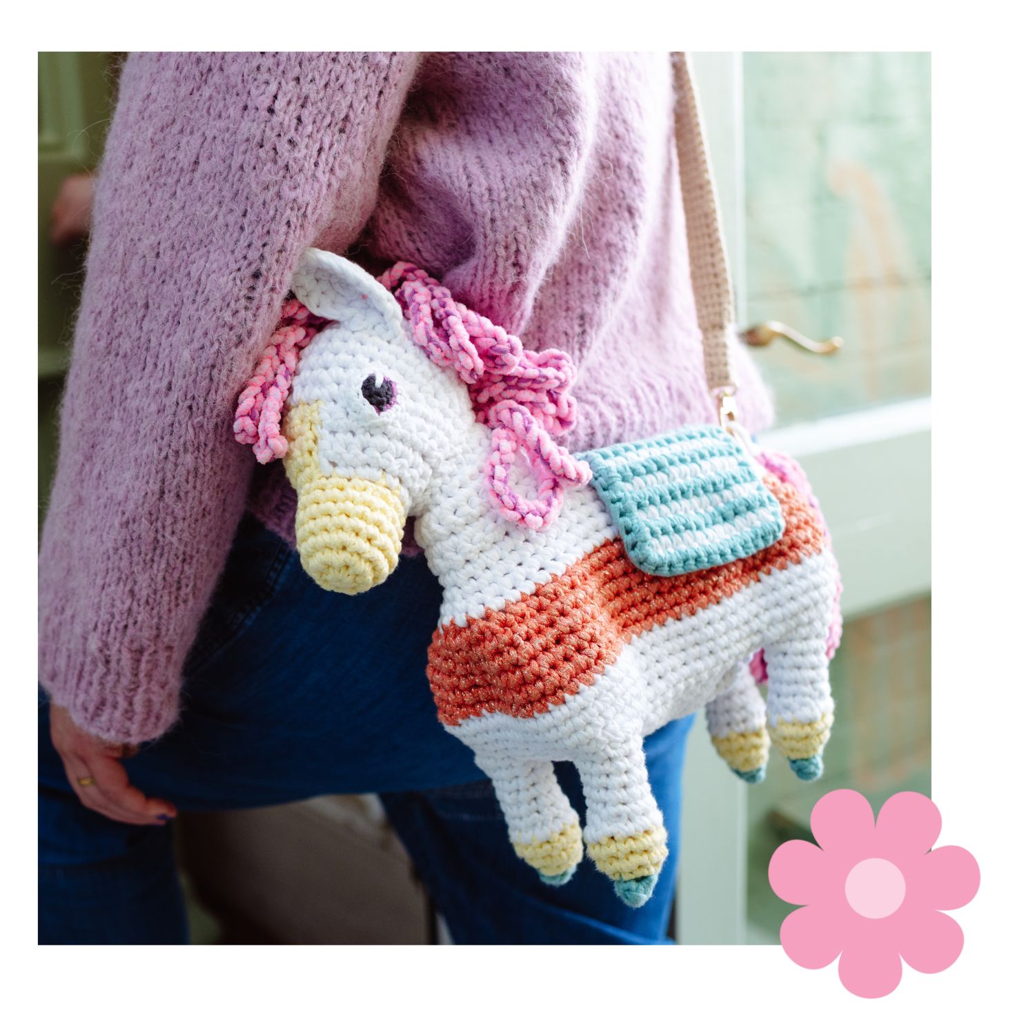 The horse’s tail is actually a removable tassel that clips onto the bag’s strap, adding movement and personality.