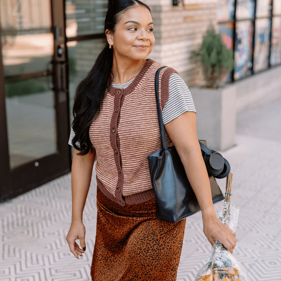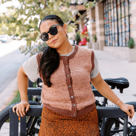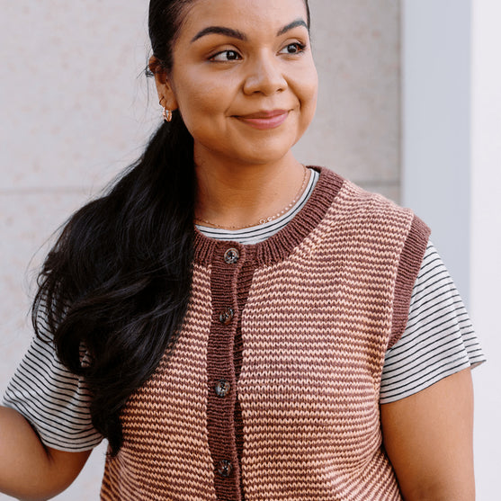 The vest is primarily worked back and forth, but circular needles must be used to “slide” the work and create single stripe rows. They are also required for the ribbing around the arms.